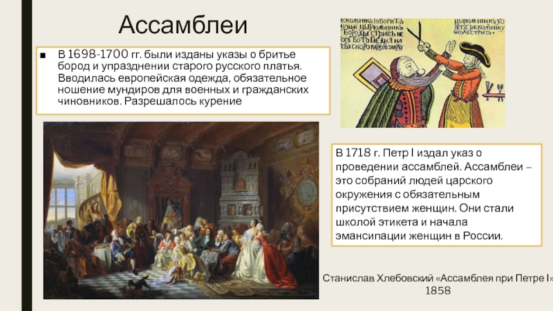В 1718 г. Петр I издал указ о проведении ассамблей. Ассамблеи – это собраний людей царского окружения с обязательным присутствием женщин. Они стали школой этикета и начала эмансипации женщин в России.
