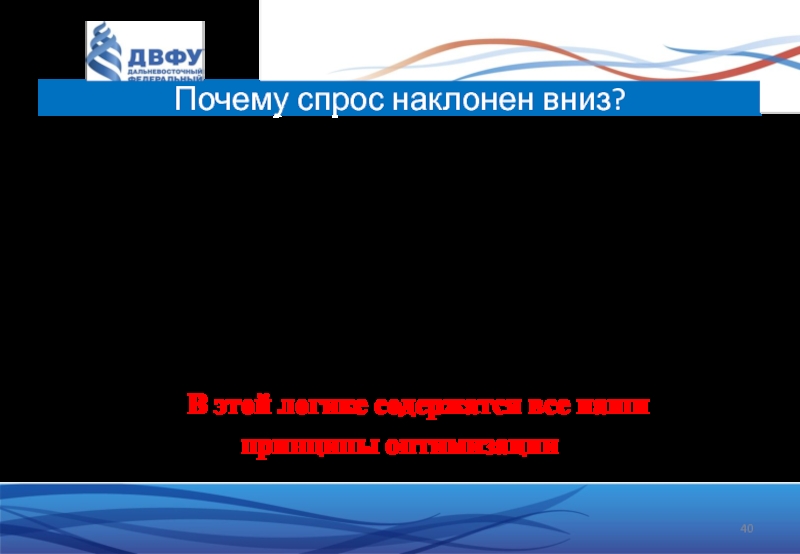 Слайд 40Такой наклон требует одного важного предположения: Убывающая предельная полезность