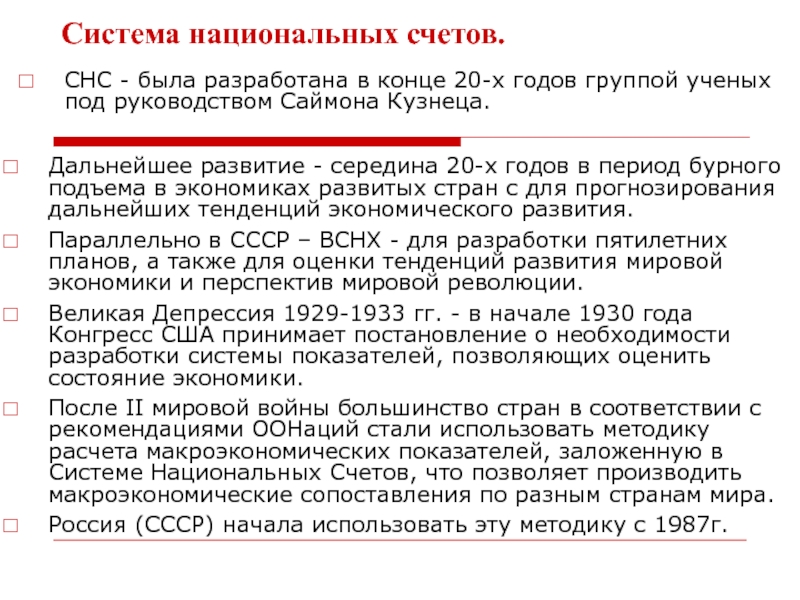 СНС - была разработана в конце 20-х годов группой ученых под руководством Саймона Кузнеца.