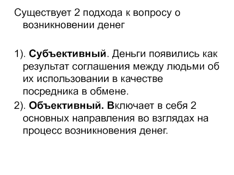 Слайд 5Существует 2 подхода к вопросу о возникновении денег
