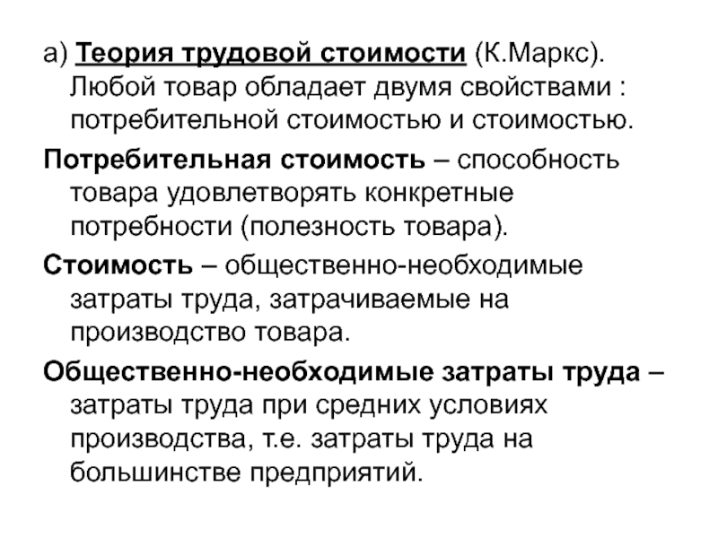 Слайд 6а) Теория трудовой стоимости (К.Маркс). Любой товар обладает двумя свойствами