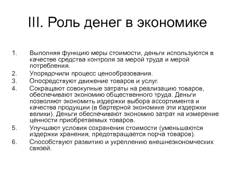 Сокращают совокупные затраты на реализацию товаров, обеспечивают экономию общественного труда. Деньги позволяют экономить издержки выбора ассортимента и качества продукции (в бартерной экономике эти издержки велики). Деньги обеспечивают экономию затрат на измерение ценности приобретаемых товаров.
