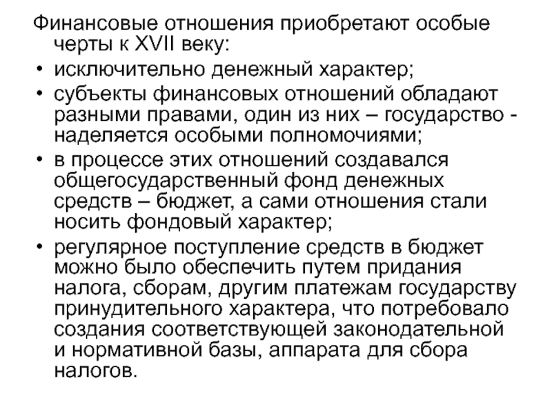 Слайд 4Финансовые отношения приобретают особые черты к XVII веку: