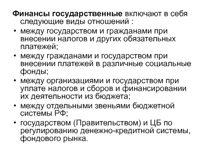 Слайд 9Финансы государственные включают в себя следующие виды отношений :