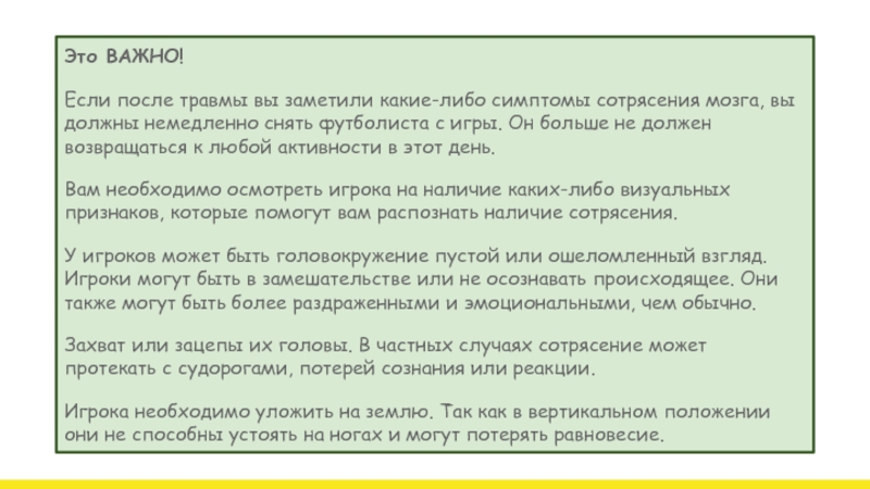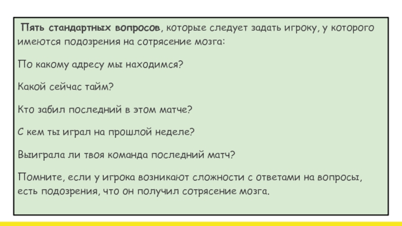 Помните, если у игрока возникают сложности с ответами на вопросы, есть подозрения, что он получил сотрясение мозга.