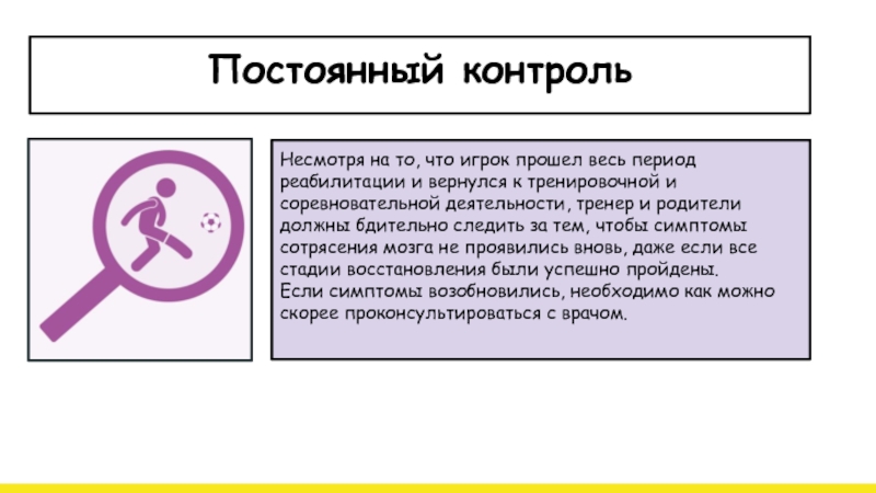 должны бдительно следить за тем, чтобы симптомы сотрясения мозга не проявились вновь, даже если все стадии восстановления были успешно пройдены.