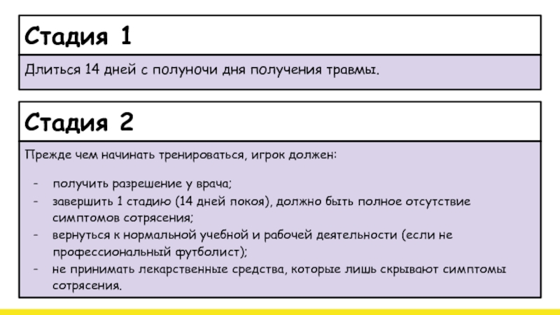 (14 дней покоя), должно быть полное отсутствие симптомов сотрясения;