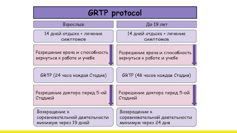 GRTP - программа постепенных мероприятий, которая разработана с целью постепенного возвращения футболистов к тренировочной и соревновательной деятельности после прохождения шести стадий, каждая из которых должна длиться минимум 24 часа.