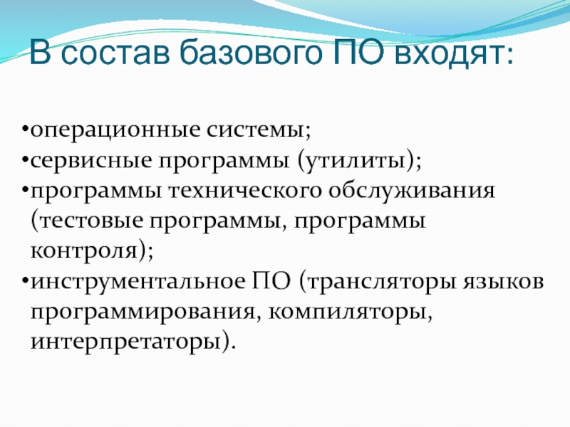Базовое (системное) ПО организует процесс обработки информации в компьютере и обеспечивает нормальную рабочую среду дня прикладных программ.