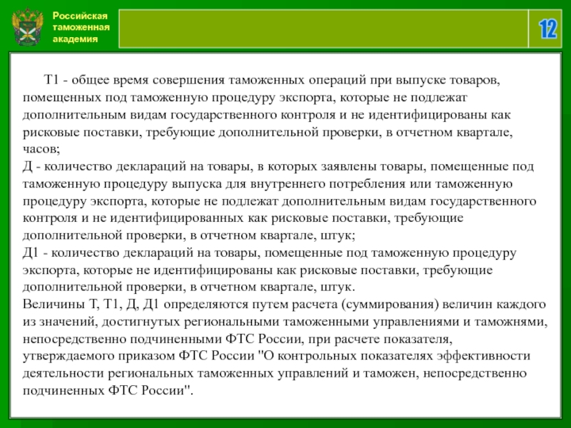 Величины T, T1, Д, Д1 определяются путем расчета (суммирования) величин каждого из значений, достигнутых региональными таможенными управлениями и таможнями, непосредственно подчиненными ФТС России, при расчете показателя, утверждаемого приказом ФТС России "О контрольных показателях эффективности деятельности региональных таможенных управлений и таможен, непосредственно подчиненных ФТС России".
