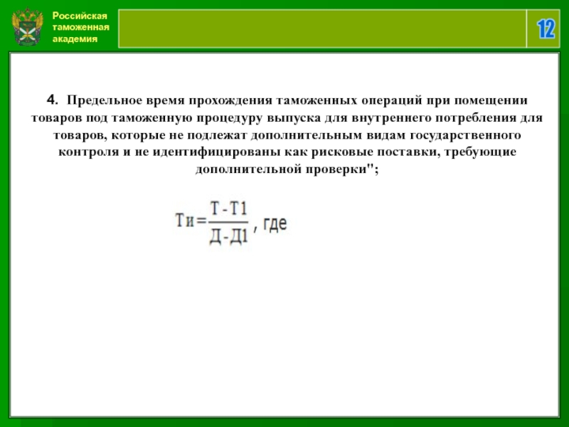 4. "Предельное время прохождения таможенных операций при помещении товаров под таможенную процедуру выпуска для внутреннего потребления для товаров, которые не подлежат дополнительным видам государственного контроля и не идентифицированы как рисковые поставки, требующие дополнительной проверки";