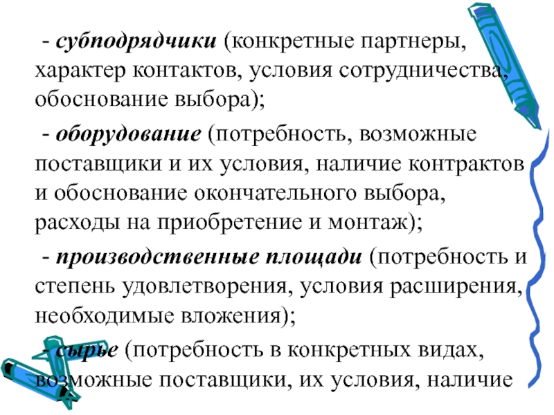 Слайд 23 - субподрядчики (конкретные партнеры, характер контактов, условия сотрудничества, обоснование выбора);