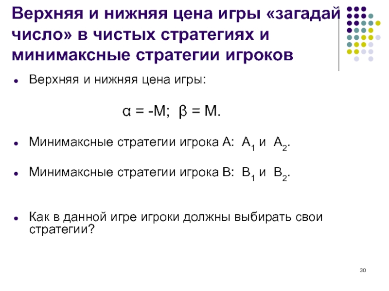 Слайд 34Пример: расчёт нижней цены игры «Загадай число» в смешанных стратегиях