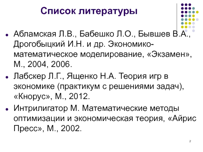 Интрилигатор М. Математические методы оптимизации и экономическая теория, «Айрис Пресс», М., 2002.