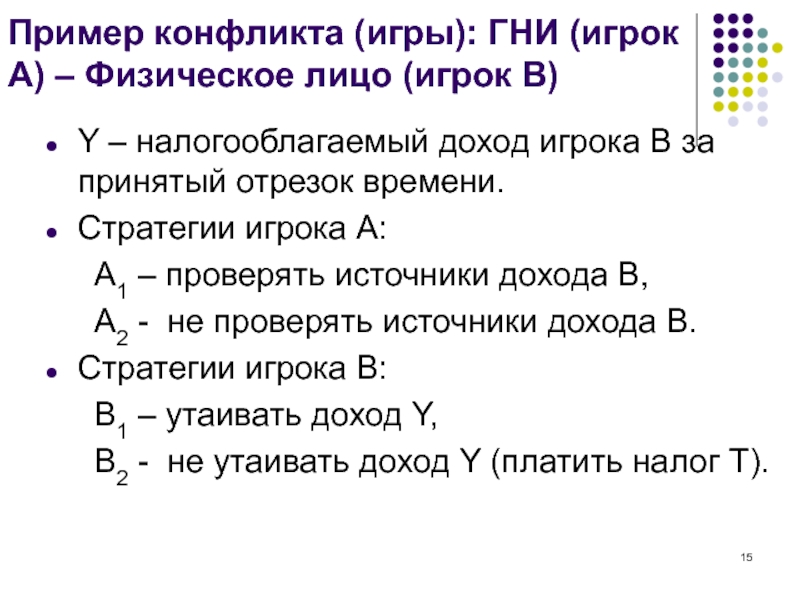 Слайд 15Пример конфликта (игры): ГНИ (игрок А) – Физическое лицо (игрок