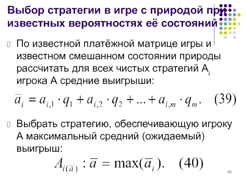 Слайд 53Выбор стратегии в игре с природой при известных вероятностях её