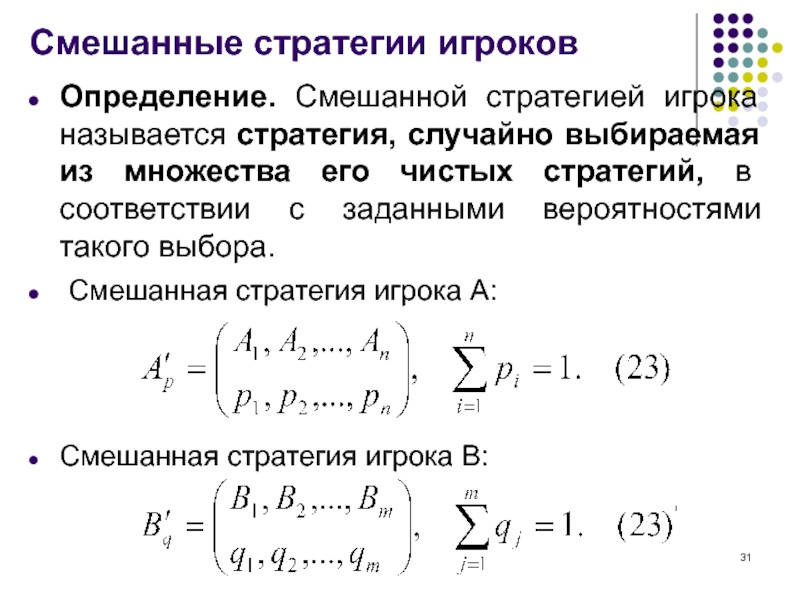 стратегии игроков именуются их оптимальными смешанными стратегиями.