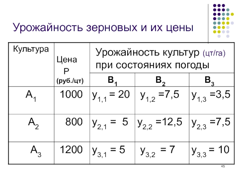 Слайд 44 Пример игры с природой (задача об оптимальной посевной стратегии