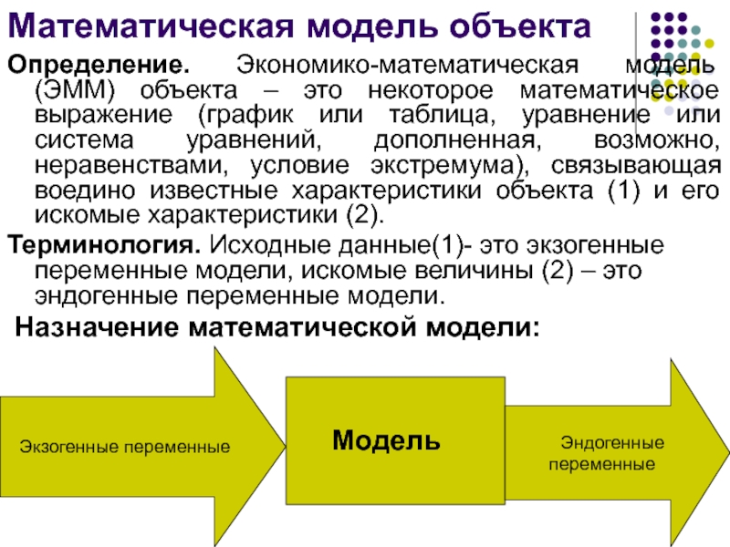 Определение. Экономико-математическая модель (ЭММ) объекта – это некоторое