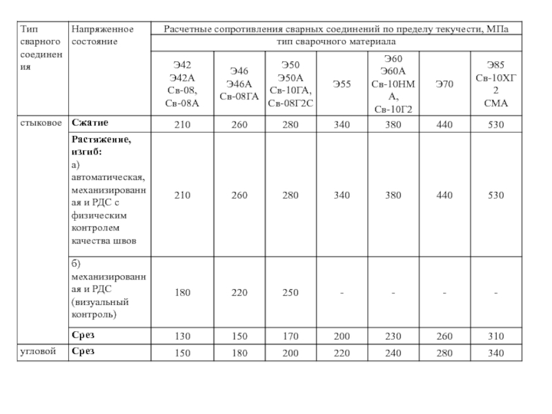 Сварные соединения сталей, выполненные дуговой сваркой , по определению допускаемых напряжений делятся на две группы. К первой группе относятся швы низкоуглеродистых сталей обычного качества и низколегированных, у которых механические свойства швов и зоны термического влияния соответствуют свойствам основного металла.