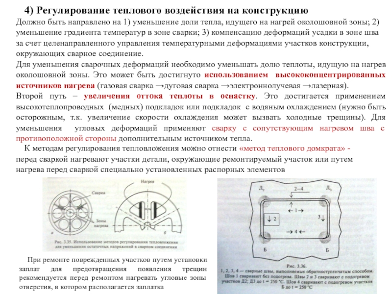 К методам регулирования тепловложения можно отнести «метод теплового домкрата» - перед сваркой нагревают участки детали, окружающие ремонтируемый участок или путем нагрева перед сваркой специально установленных распорных элементов