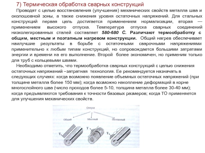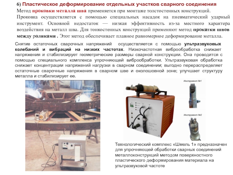 Снятие остаточных сварочных напряжений осуществляется с помощью ультразвуковых колебаний и вибраций на низких частотах. Низкочастотная виброобработка снижает напряжения и стабилизирует геометрические размеры сварной конструкции. Она проводится с помощью специального комплекса упрочняющей виброобработки. Ультразвуковая обработка снижает концентрации напряжений нагрузки в сварном соединении; выгодно перераспределяет остаточные сварочные напряжения в сварном шве и околошовной зоне; улучшает структуру металла и стабилизирует ее.
