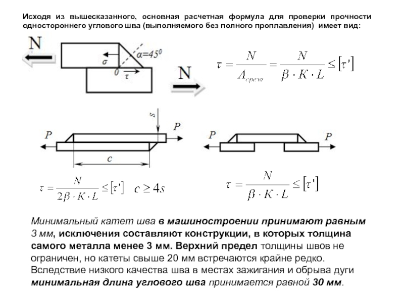Исходя из вышесказанного, основная расчетная формула для проверки прочности одностороннего углового шва (выполняемого без полного проплавления) имеет вид: