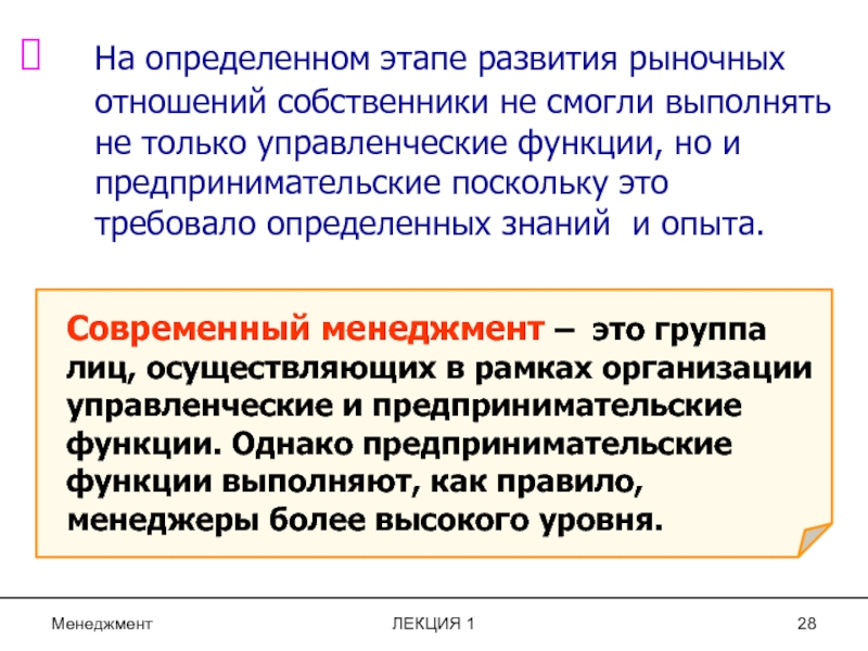 Современный менеджмент – это группа лиц, осуществляющих в рамках организации управленческие и предпринимательские функции. Однако предпринимательские функции выполняют, как правило, менеджеры более высокого уровня.