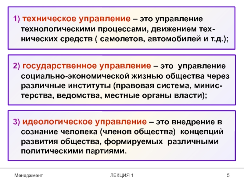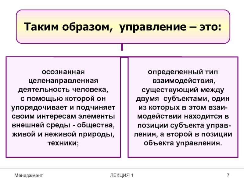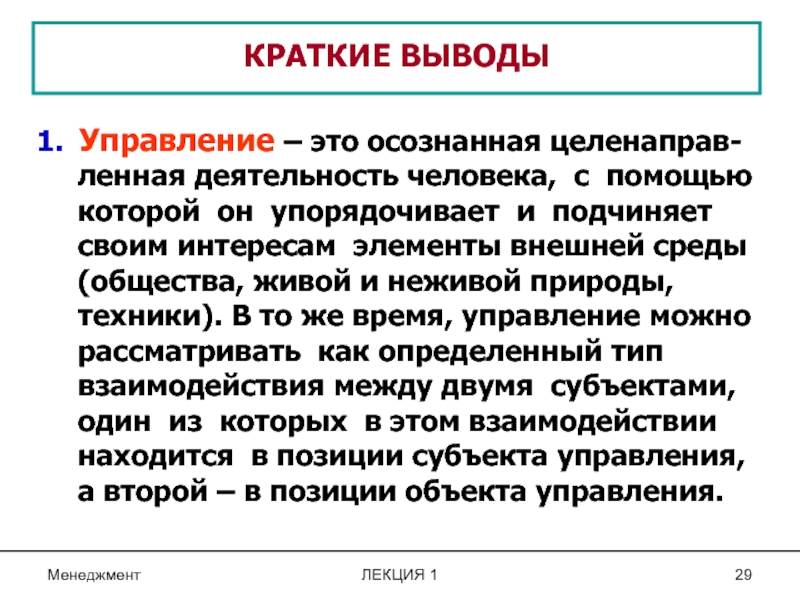 1. Управление – это осознанная целенаправ-ленная деятельность человека, с