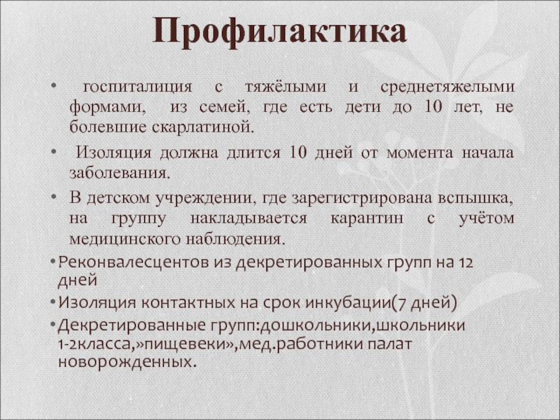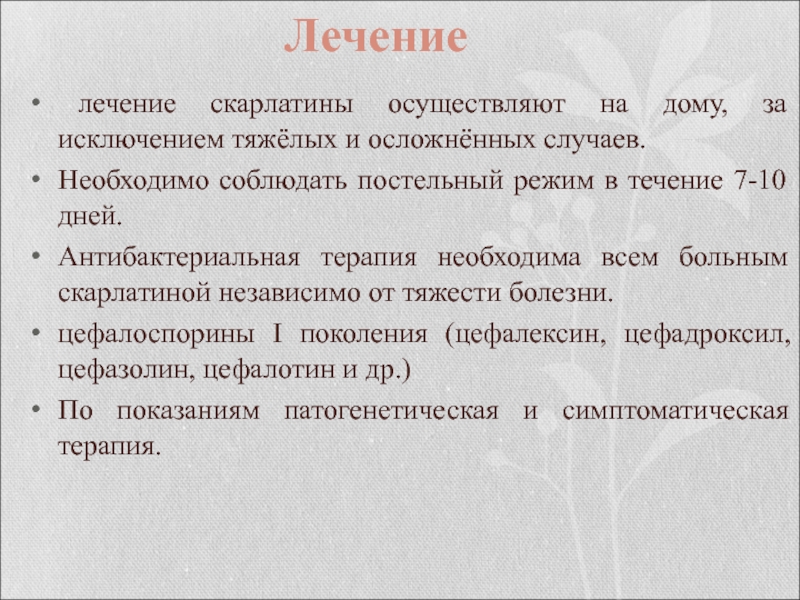 Слайд 39 лечение скарлатины осуществляют на дому, за исключением тяжёлых и