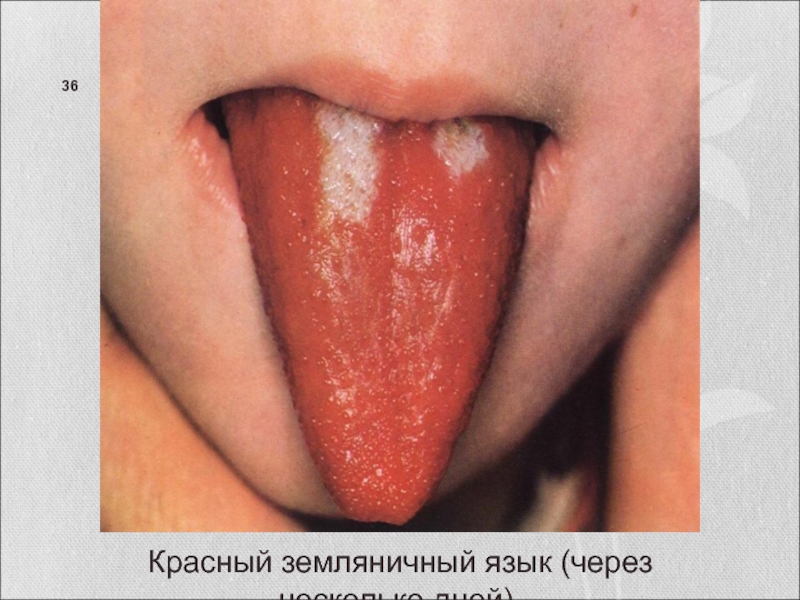 Слайд 36Красный земляничный язык (через несколько дней).