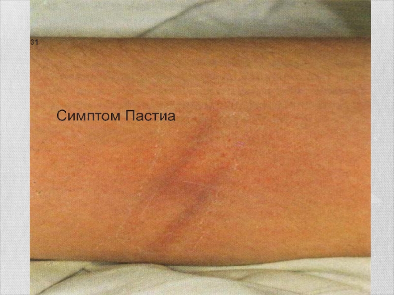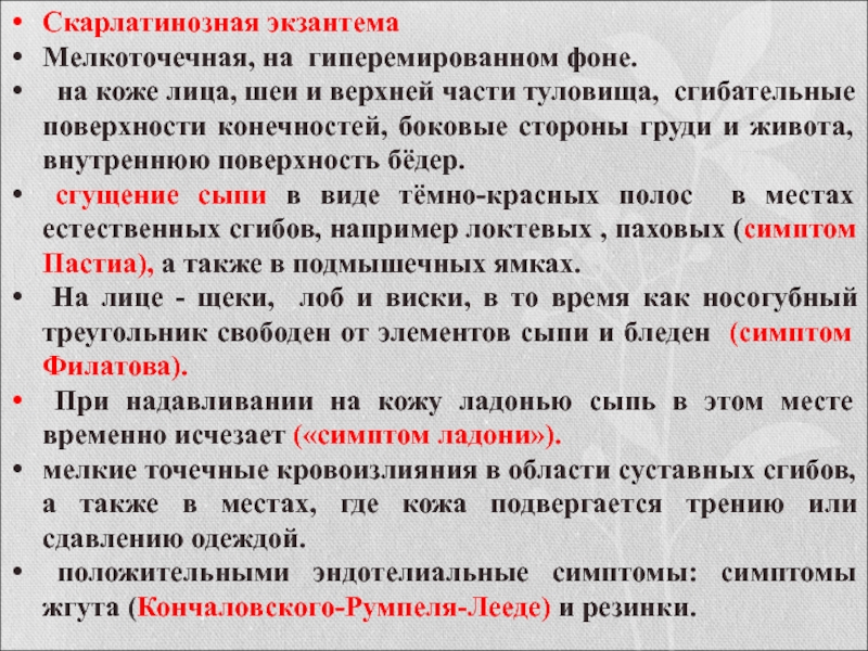 сгущение сыпи в виде тёмно-красных полос в местах естественных сгибов, например локтевых , паховых (симптом Пастиа), а также в подмышечных ямках.