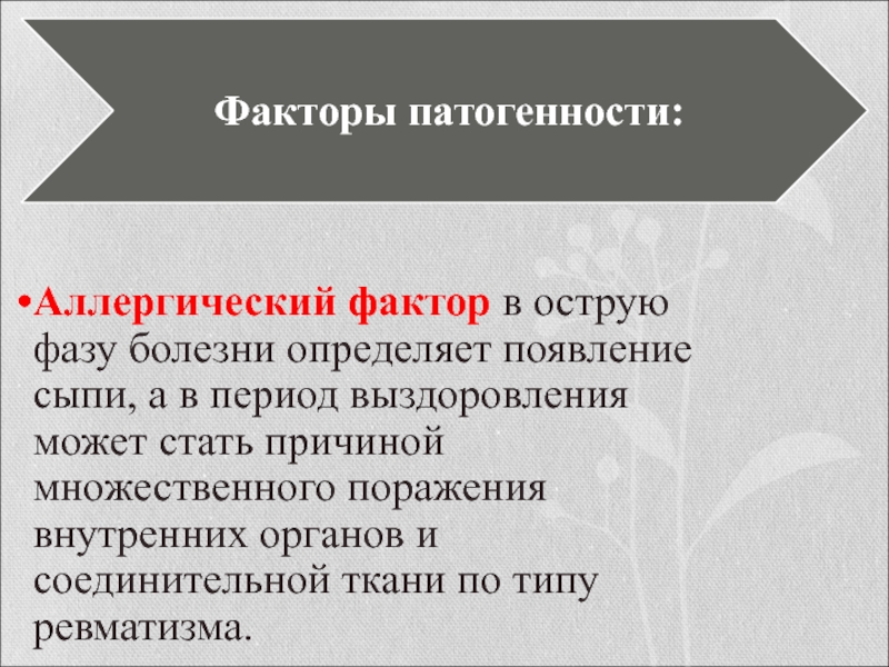 Компоненты клеточной стенки стрептококка (групповой А-полисахарид, пептидогликан, белок М) и внеклеточные продукты (стрептолизины, гиалуронидаза, ДНК-аза и др.) обусловливают развитие реакций гиперчувствительности замедленного типа, аутоиммунных реакций, формирование и фиксацию иммунных комплексов, нарушения системы гемостаза.