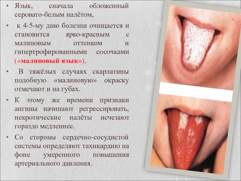 В тяжёлых случаях скарлатины подобную «малиновую» окраску отмечают и на губах.
