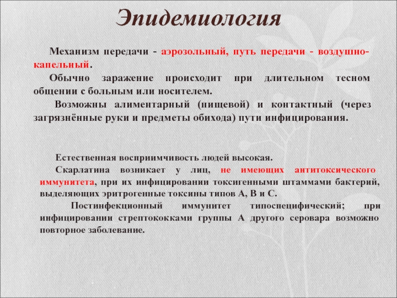 Скарлатина возникает у лиц, не имеющих антитоксического иммунитета, при их инфицировании токсигенными штаммами бактерий, выделяющих эритрогенные токсины типов А, В и С.