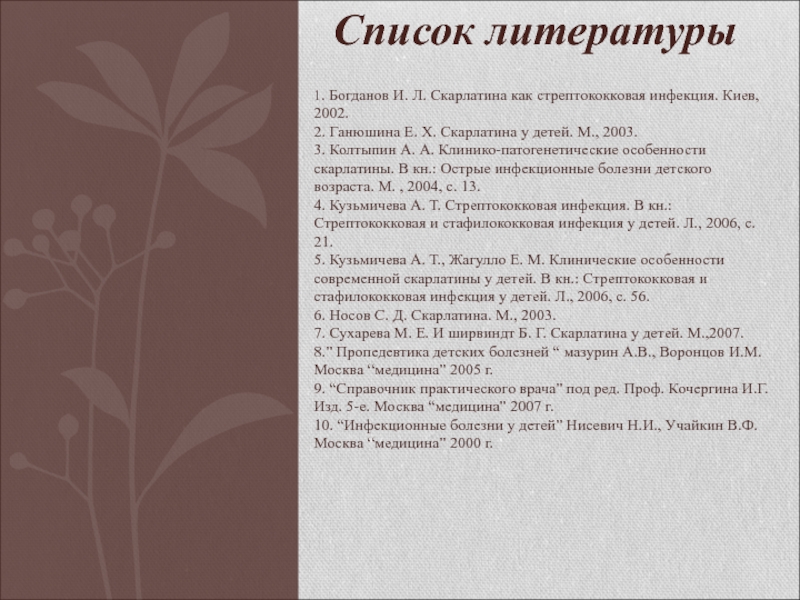 1. Богданов И. Л. Скарлатина как стрептококковая инфекция. Киев,