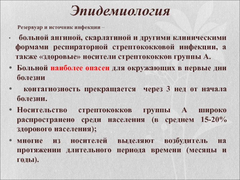 Носительство стрептококков группы А широко распространено среди населения (в среднем 15-20% здорового населения);