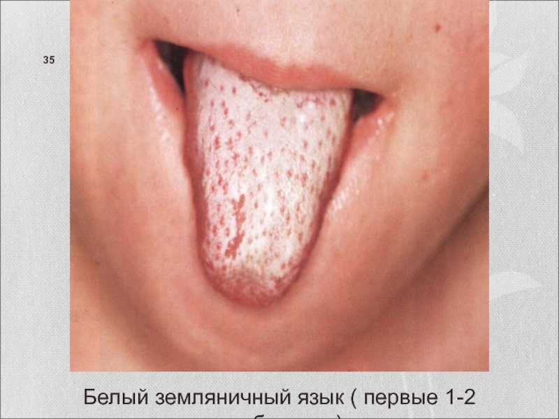 Слайд 35Белый земляничный язык ( первые 1-2 дня болезни).