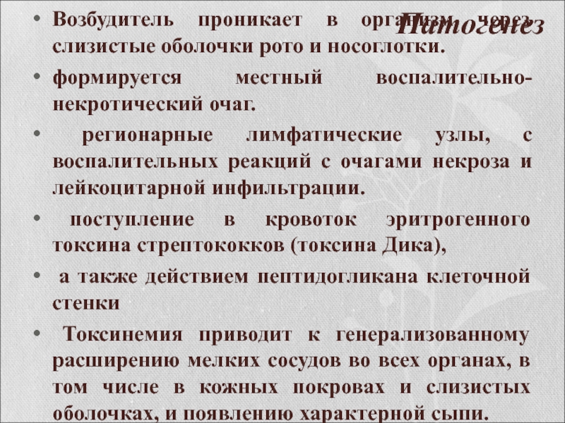 Токсинемия приводит к генерализованному расширению мелких сосудов во всех органах, в том числе в кожных покровах и слизистых оболочках, и появлению характерной сыпи.