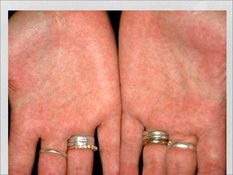 При надавливании на кожу ладонью сыпь в этом месте временно исчезает («симптом ладони»).