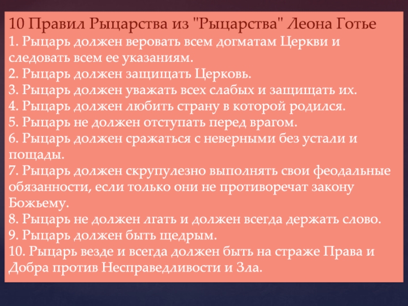 10 Правил Рыцарства из "Рыцарства" Леона Готье1. Рыцарь должен веровать всем догматам Церкви и следовать всем ее указаниям.2. Рыцарь должен защищать Церковь.3. Рыцарь должен уважать всех слабых и защищать их.4. Рыцарь