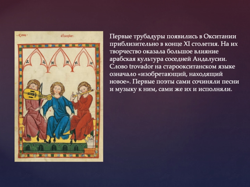 Слайд 6Первые трубадуры появились в Окситании приблизительно в конце XI столетия.