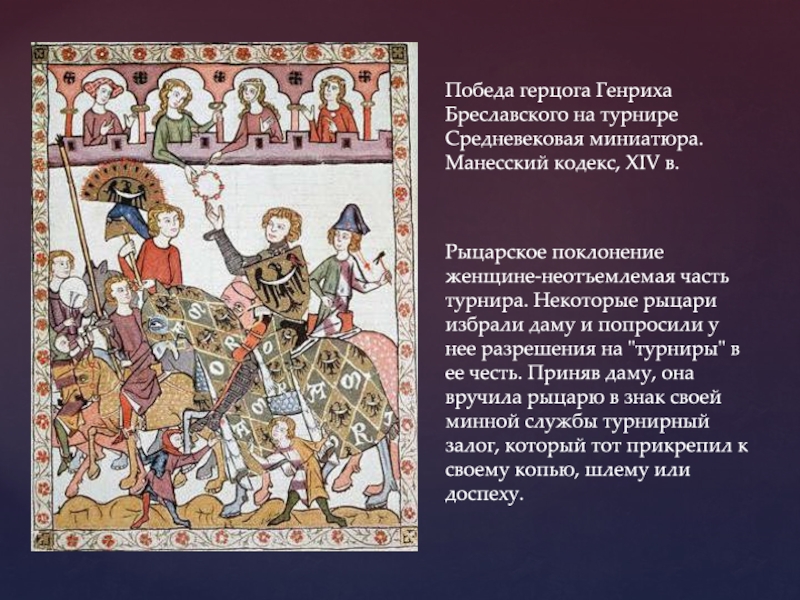 Слайд 9Победа герцога Генриха Бреславского на турнире Средневековая миниатюра. Манесский кодекс, XIV в. Рыцарское