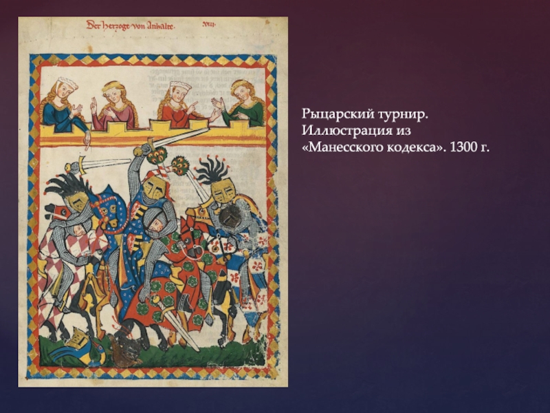 Слайд 8Рыцарский турнир. Иллюстрация из «Манесского кодекса». 1300 г.