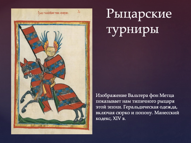 Изображение Вальтера фон Метца показывает нам типичного рыцаря этой эпохи. Геральдическая одежда, включая сюрко и попону. Манесский