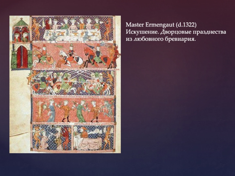 Слайд 13Master Ermengaut (d.1322) Искушение. Дворцовые празднества из любовного бревиария.