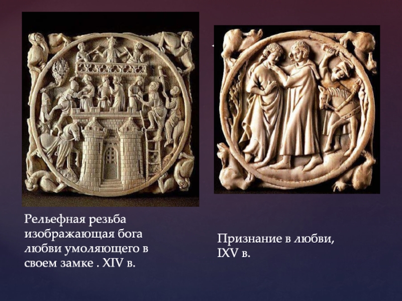 Рельефная резьба изображающая бога любви умоляющего в своем замке . XIV в.Признание в любви, IXV в.