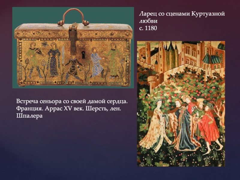 Ларец со сценами Куртуазной любвис. 1180Встреча сеньора со своей дамой сердца. Франция. Аррас XV век. Шерсть, лен.