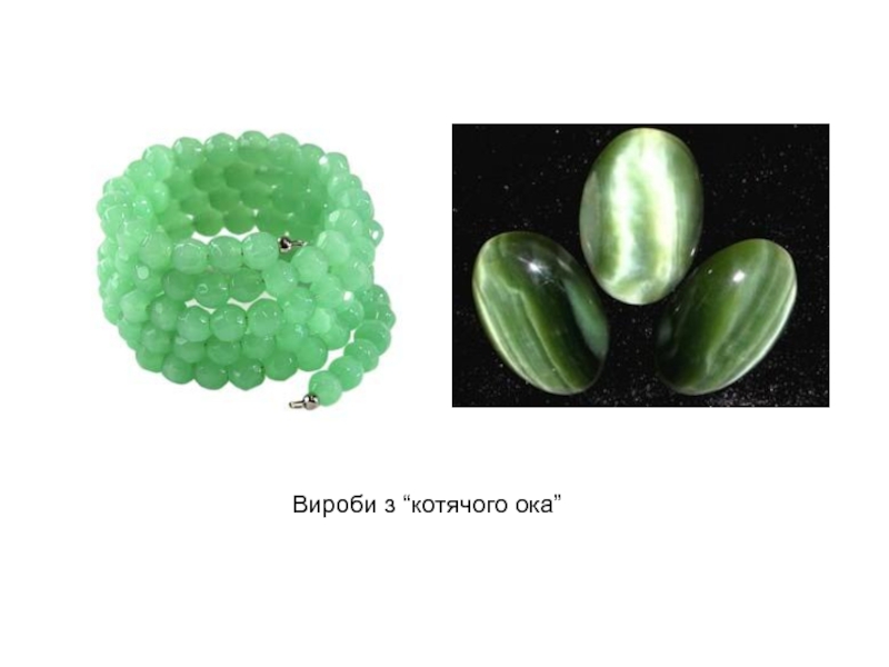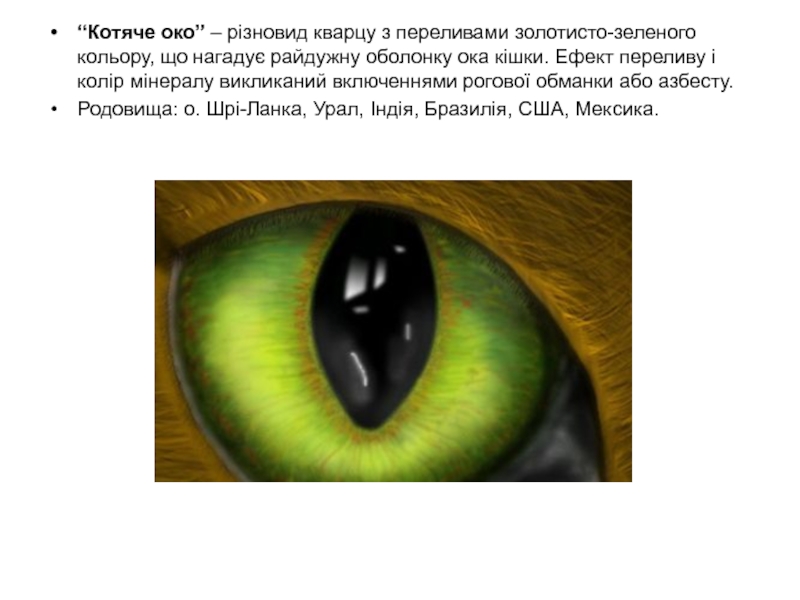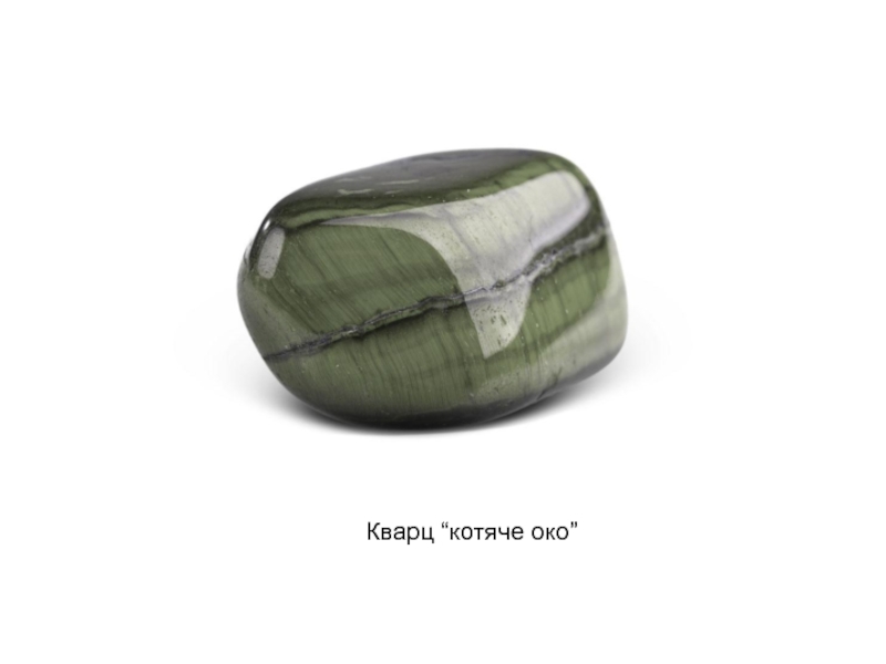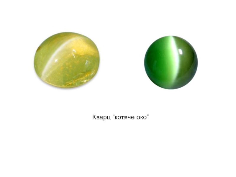 Слайд 64“Котяче око” – різновид кварцу з переливами золотисто-зеленого кольору, що