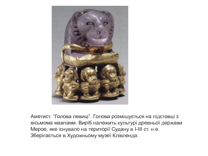 Слайд 36Аметист. “Голова левиці”. Голова розміщується на підставці з вісьмома мавпами.